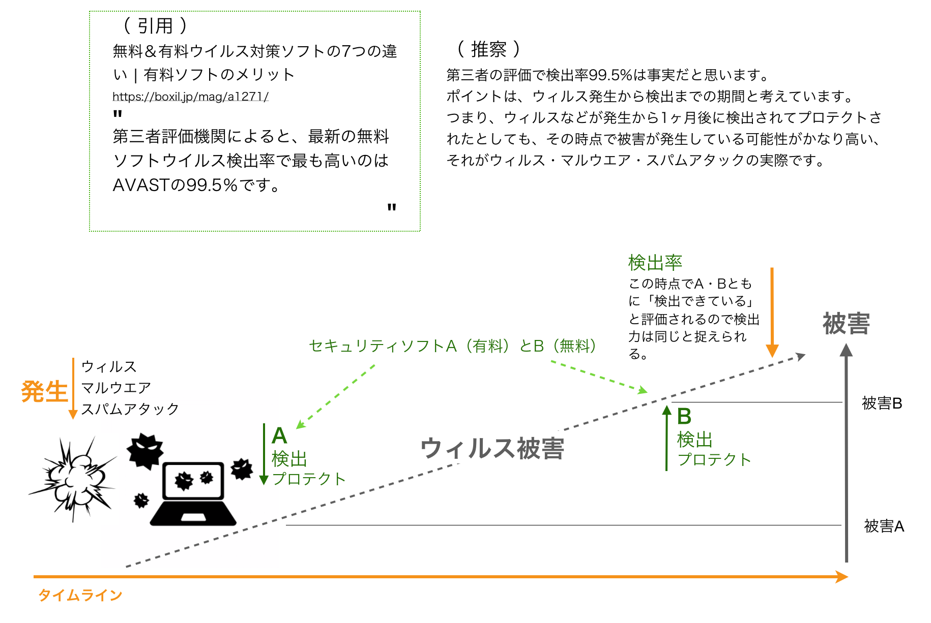 以下の図「検出してプロテクト」について有料ソフトAと無料ソフトBどちらが被害を小さく抑えられるかは一目瞭然です。つまり、有料セキュリティソフトは、ウィルスやマルウエアなどが発生(生成)されて、早期に対応プロファイル(ソフトウエアアップデート)が適応されます。それにくらべて無料ソフトの場合は、どうしてもこの点が遅くなり、その時間差で被害が大きくなってしまう事が想定される。