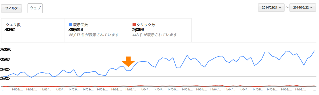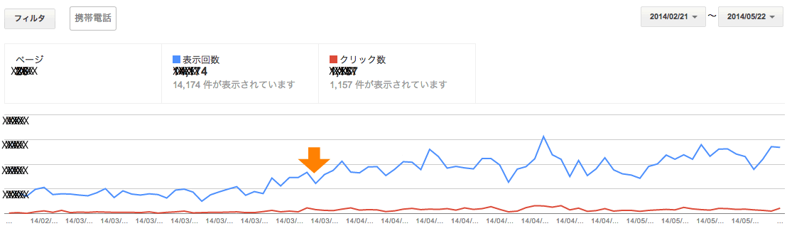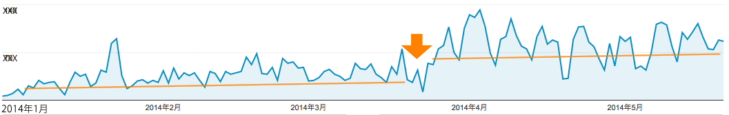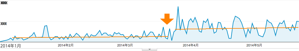 オレンジ色の矢印の辺りが大きな分岐点となっていますが、タイミングとしては、ほぼパンダアップデート(※1)の日と重なります。つまり、対象サイトが、対象ユーザーにとって有効なコンテンツである、という評価をいただいたと捉えています。