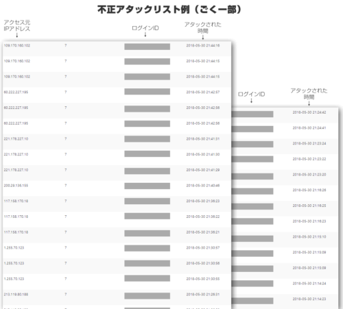 左の図は、不正なアタックのリストのごく一部です。不正アタックとは、管理画面にログインを試みるアタックを不正アタックと呼んでいます。